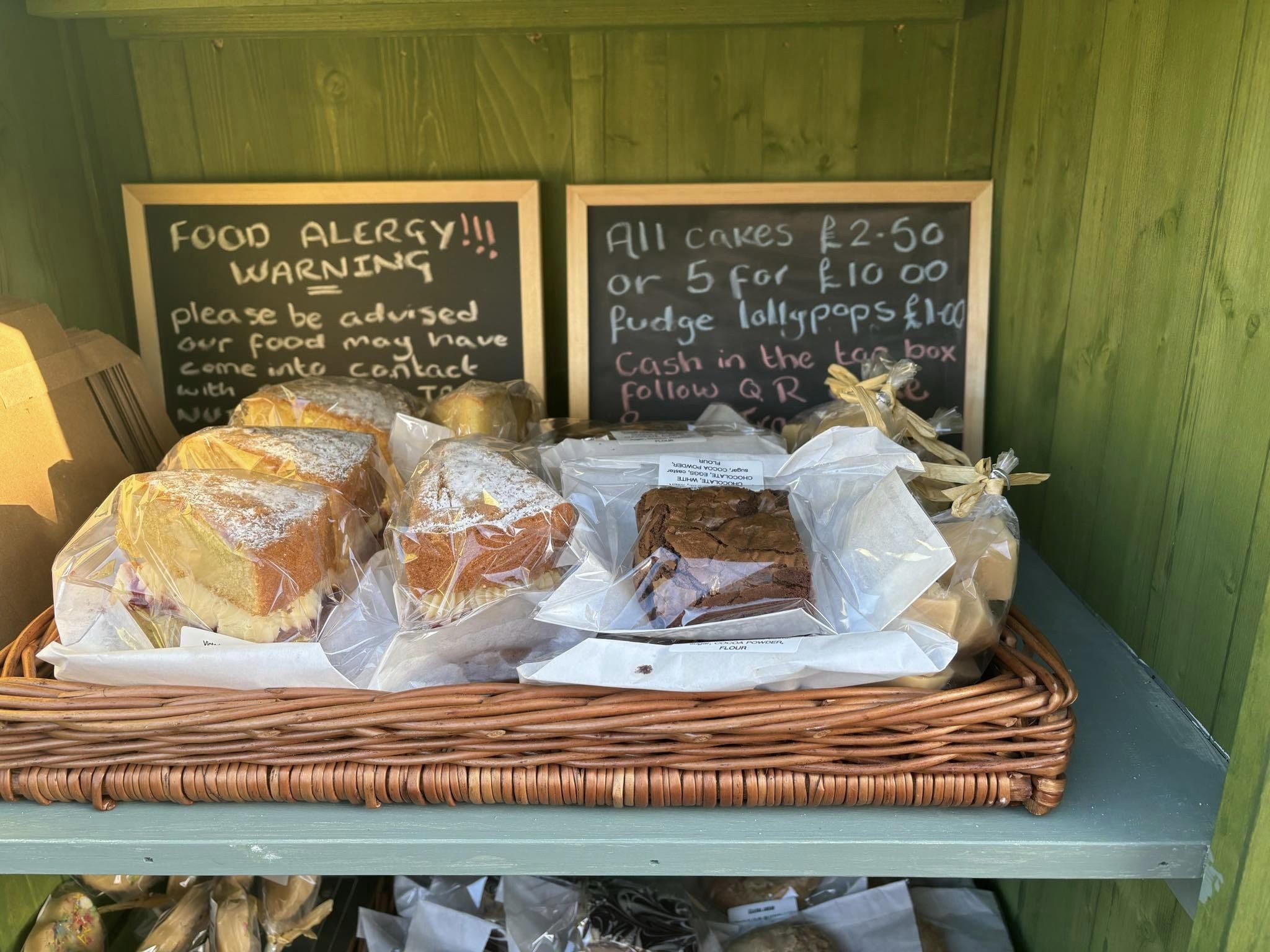 The Cake Shed selection is changed daily. So far we’ve had fudge, fudge lollies, millionaire’s shortbread, eccles cakes, brownies, rocky road, lemon drizzle, bakewell tart, tea bread, victoria sponge, pecan pie, coffee and walnut cake, rice krispie cakes, and many more!
